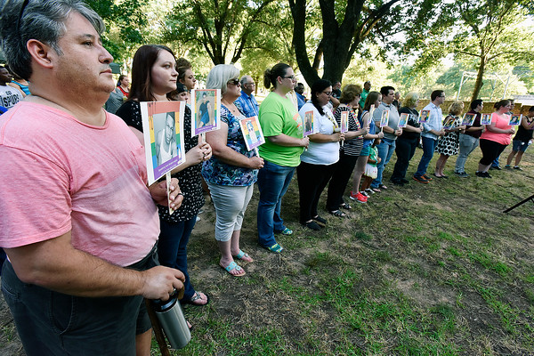 Volunteers hold photos of the 49 people killed Sunday in the Orlando nightclub shooting during a Thursday memorial service at Bergfeld Park in Tyler. A single bell tolled and the line of volunteers grew as each name was read, followed by a brief biography in the person and their age. Andrew D. Brosig/Tyler Morning Telegraph