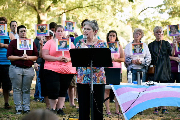 Brenda McWilliams, a founding member of East Texas PFLAG, is flanked by volunteers holding photos of people killed in the Orlando nightclub shooting as she thanks the crowd for attending a memorial vigil Thursday at Bergfeld Park in Tyler. Andrew D. Brosig/Tyler Morning Telegraph