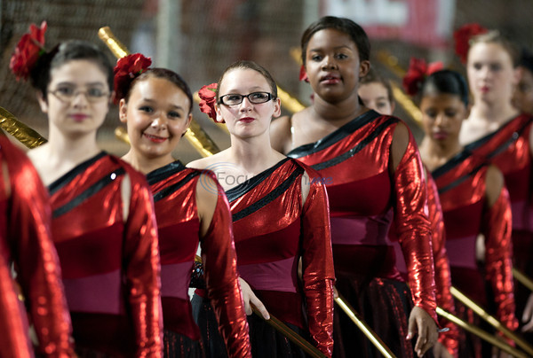 Robert E. Lee marching band color guard members walk down to the field before the start of their halftime show at the football game between Robert E. Lee High School and Lufkin Friday night at Trinity Mother Frances Rose Stadium in Tyler.
