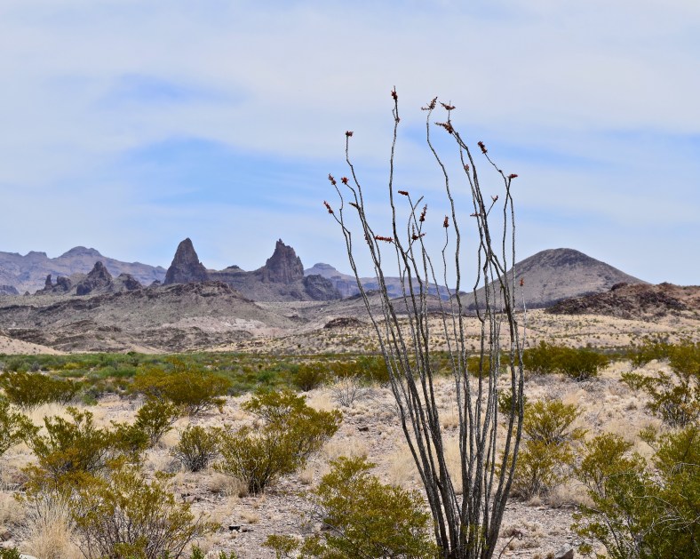 The Mule Ears formation and the abundant ocotillo plant on the Ross Maxwell Scenic Drive.