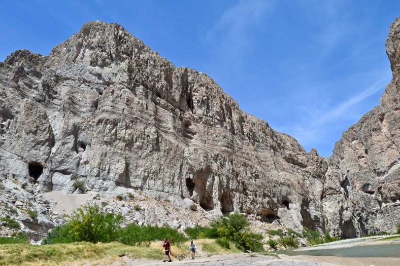 Hickers dwarfed by the massive wall of the Sierra del Carmen on the Texas side of the river.
