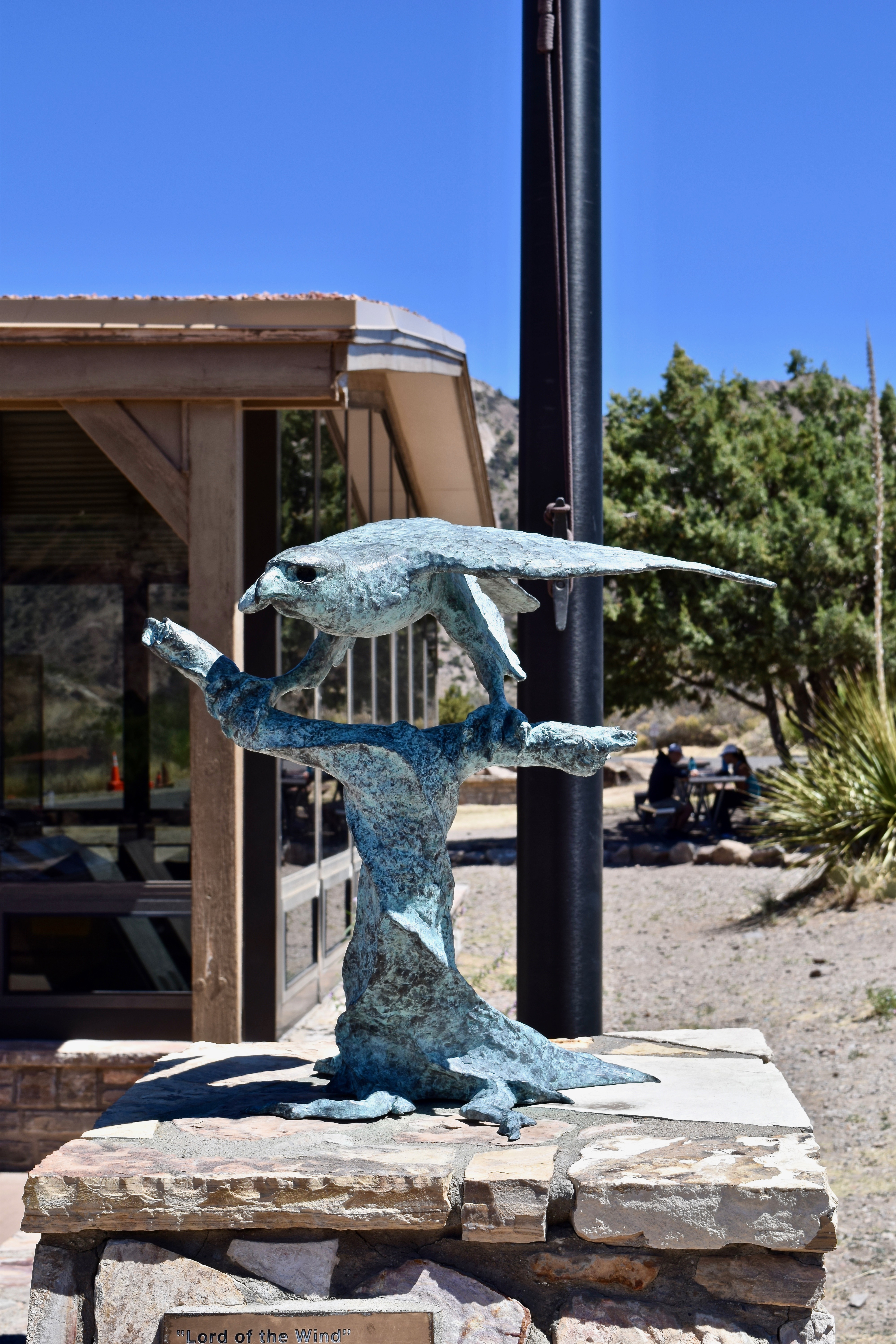 The Peregrine Falcon statue outside the Chisos Basin Visitor Center. Portions of the trails are closed March through May to protect them during their nesting season.