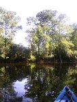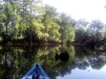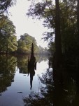 I have moored myself between the cypress knees on the shady east side of Big Cypress Bayou. I am about seven and one-half miles downstream from Jefferson, Texas, and maybe a half-mile from where I entered the bayou at my Dad’s property. Again, “Dad’s property.” He has been deceased almost three years, and I continue to have difficulty saying “my property.”