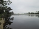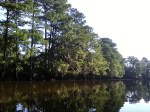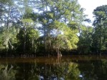 The stillness and the quiet are palpable. The cachophony of sound is delightful. Now is that not a paradoxical observation – or, more accurately, an auditory sensation! In addition to the aforementioned jumping and flopping back into the water and the dragonflies buzzing, I hear the cardinal singing, the woodpecker pecking, the squirrel chattering, a crow cawing, and the cicada’s chorus. Either bank is robed in towering bald cypress and decorated with hundreds of beautiful, yet grotesque looking, cypress knees bent in homage to the life giving trees. Oh, no! Can’t be! Yes, it is—an electric power line is running through the branches of the trees. Oh, well! So much for getting away from civilization.