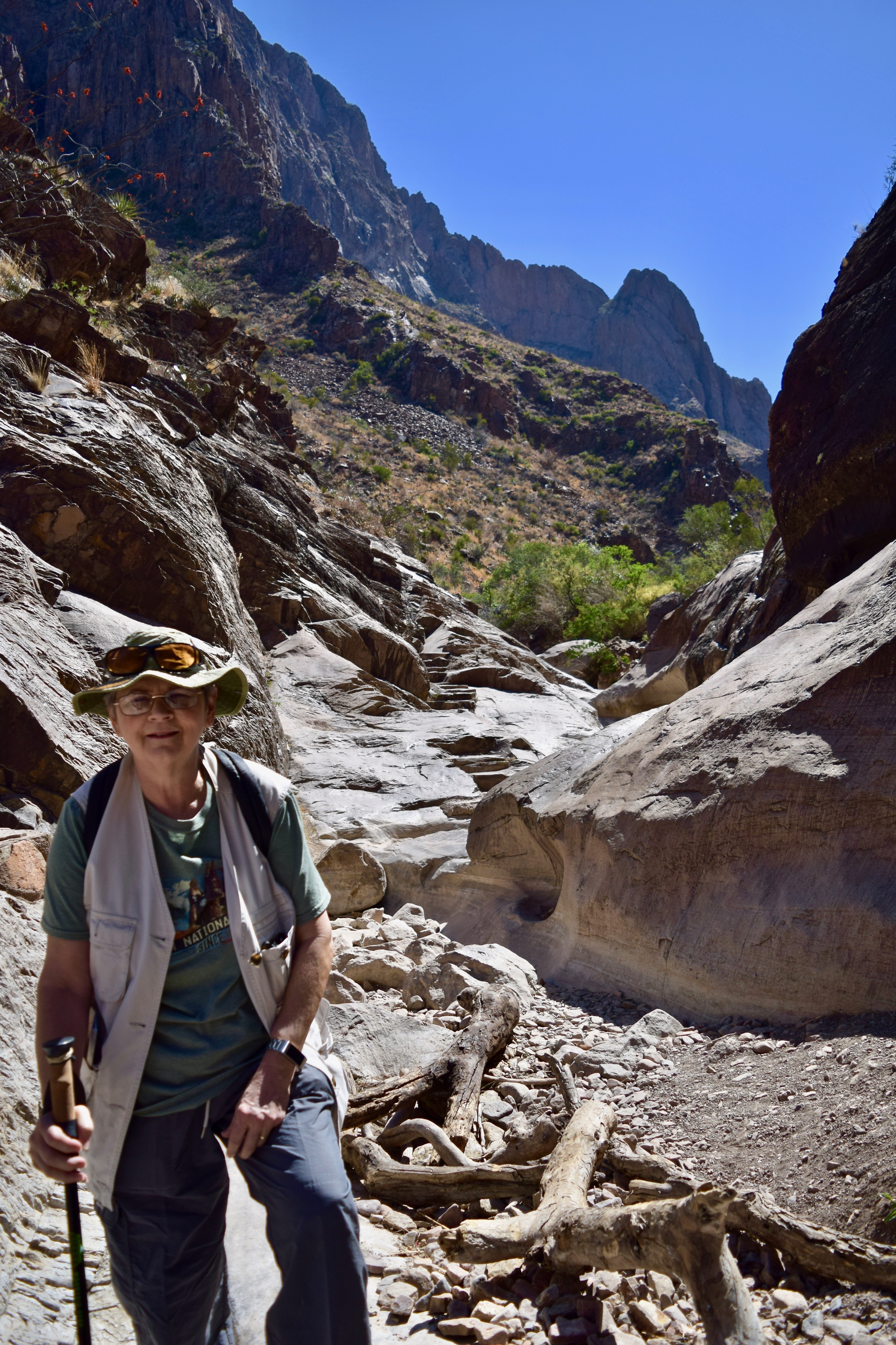 - Lou Anne on the Chisos Basin Loop Trail with the Window in the background.