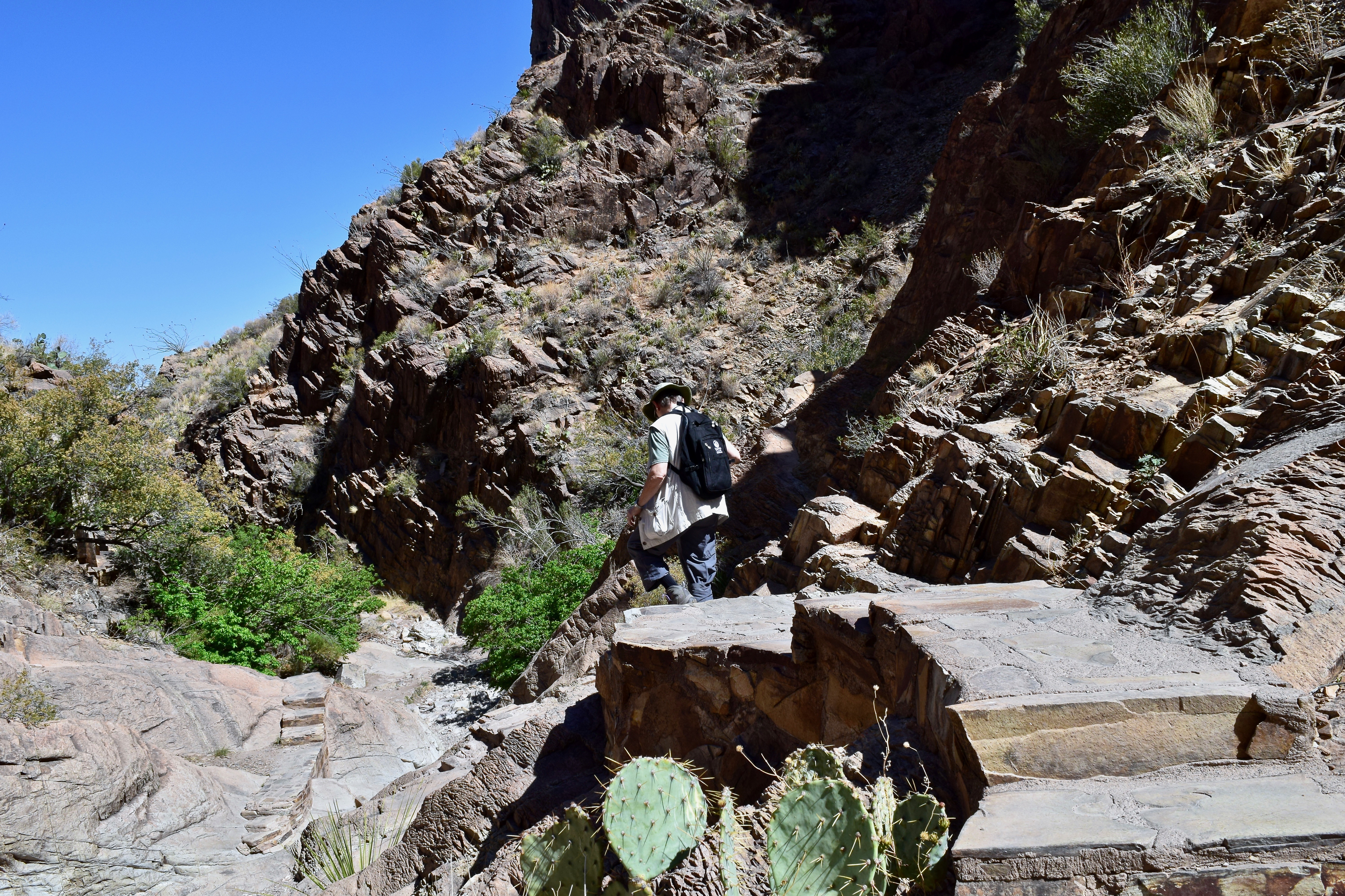 - Hiker heading back up the Boquillas Canyon Trail as others start the descent.